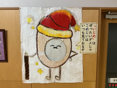 実は、光のページェントの後、光のページェントで使った思い入れのある記念撮影用の「こめじい」のボードを、6年生からもらいました。そこで、顔を入れるところに「こめじい」の顔をつけて、校長室の前に掲示させてもらっています。