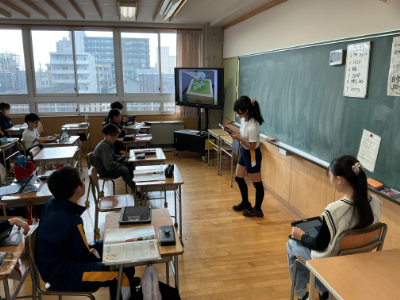 5年2組は、自分が選んだ都道府県について、英語でスピーチです。各地の美味しそうなグルメが登場して、「おなかがすいた~!」と声がもれていました。