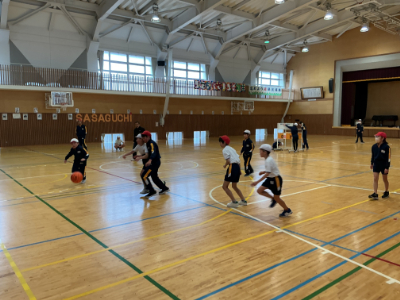 5年1組は、体育館でバスケットボールのゲームです。いいパスがつながってシュートシーンもたくさんあります。