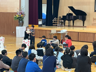 そして、4人の子どもたちが代表で、これまでがんばったことやこれからがんばりたいことを発表してくれました。大勢の前でさぞ緊張したことでしょう。ですが、とても素敵な内容で立派に発表を行い、大きな拍手がありました。発表内容は、「学校だより」に掲載されていますのでどうぞご覧ください。