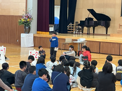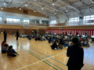 今日は、令和7年度後期の終業式のため、朝から体育館に全校児童が集まりました。今朝は気温がかなり下がったので、ジェットヒーターをたきました。