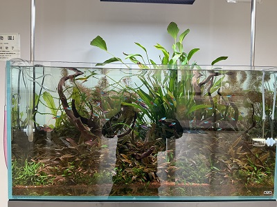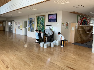 笹口小学校の多目的ホールには、大きな水槽があります。5種類くらいの生き物が生活しているようです。地域の専門学校の協力によって維持管理してもらっています。学生さんが生き物の世話をしていると、自然と子どもたちが集まってきます。魚の話や水槽管理など、直接お話しできて楽しそうです。