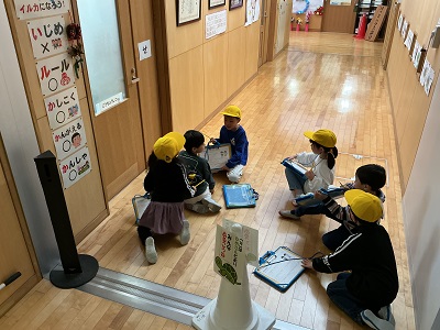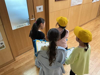 1年生の校内探検が行われました。先輩2年生に道案内や部屋の説明をしてもらいながら、学校内のいろいろな場所を探検しました。「この部屋は私達の教室と違う」「廊下がつながっている」など、発見したことや気付いたことを教え合っていました。