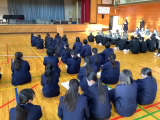 生徒会本部と3学年委員が協力して,これまでの行事のスライドショーが行われ,,全校生徒が参加しました。「スライドで行事をふりかえることで全校の士気を高めたい」という生徒会の思いから,今年度初めて行われました。ウオーキングをかわきりにこれまでの3ヵ月間のスライドを見て,生徒たちは歓声をあげるなど楽しそうに見入っていました。