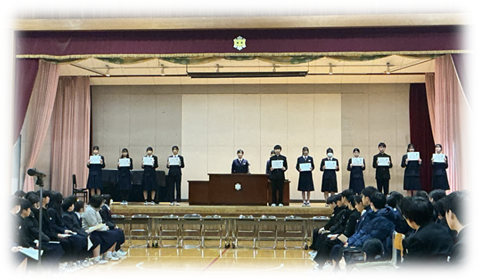 続いて行われた認証式では、新たに2年生が専門委員長として認証され、1・2年生の書記局員も任命されました。証書授与の場では、どの生徒も引き締まった表情で、これからの役割に向き合おうとする意欲が伝わってきました。