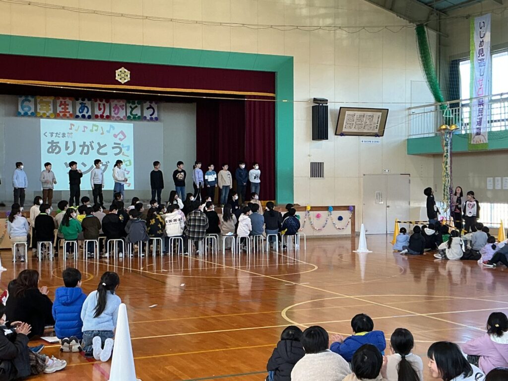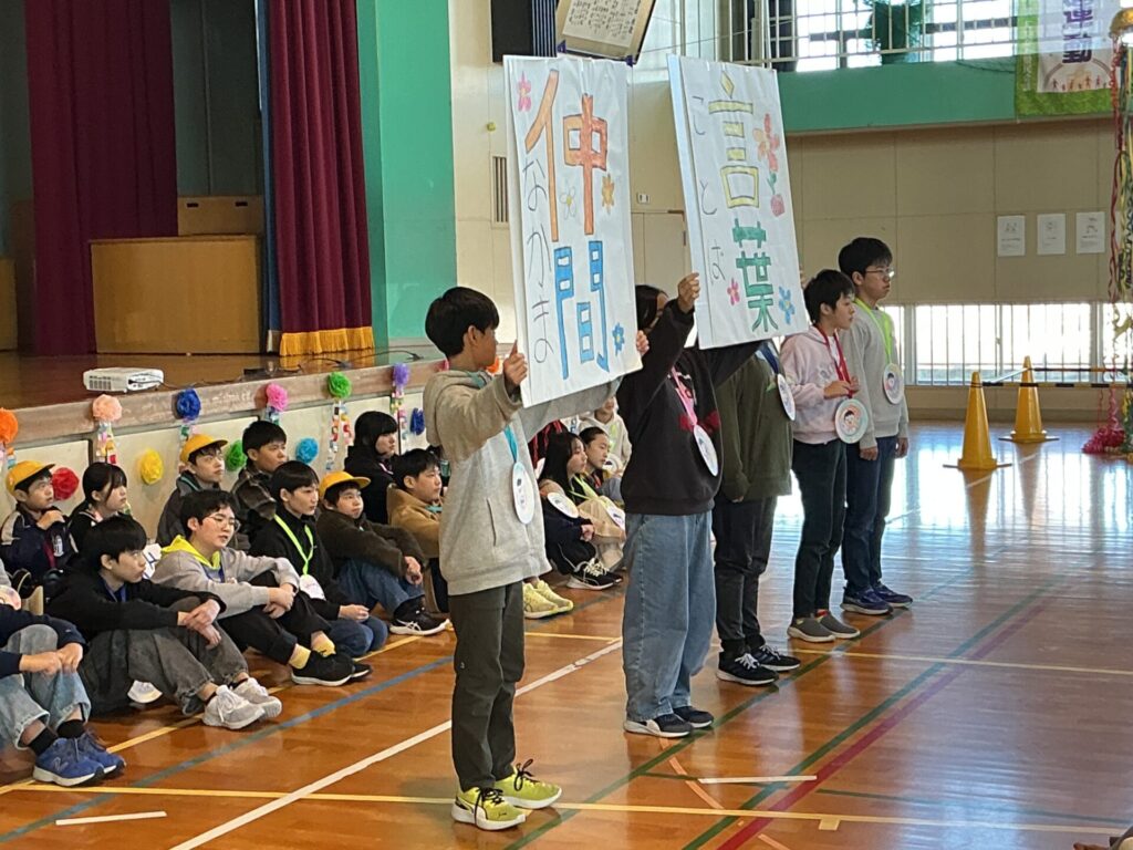 この日までに、お世話になった6年生へ感謝の気持ちを伝えようと、5年生が中心となり準備を進めてきたありがとう集会。1年生はメダル作り、2年生は寄せ書きデコレーションと入退場のアーチ、3年生はステージ・玄関前飾り、4年生はくす玉とありがとうソングと各学年からも思いをたくします。ファミリー班でゲームを楽しみ、6年生との思い出を深めました。くす玉がきれいに割れ、ありがとうソングが体育館に響きわたりました!6年生からの素敵なメッセージもあり、感動に包まれました。5年生の進行も大成功100点満点でした!卒業までの残り少ない日々、6年生との思い出を大切にしながら、より良い学校を築いていきましょう!