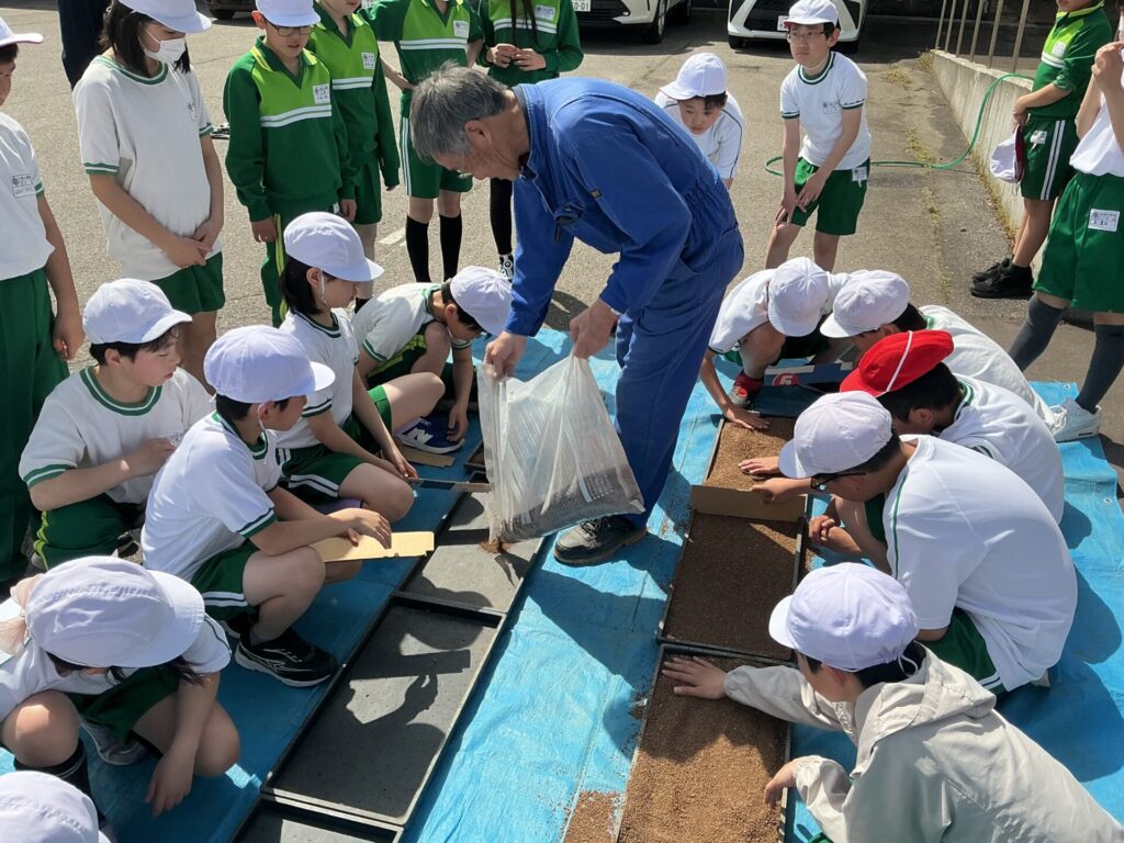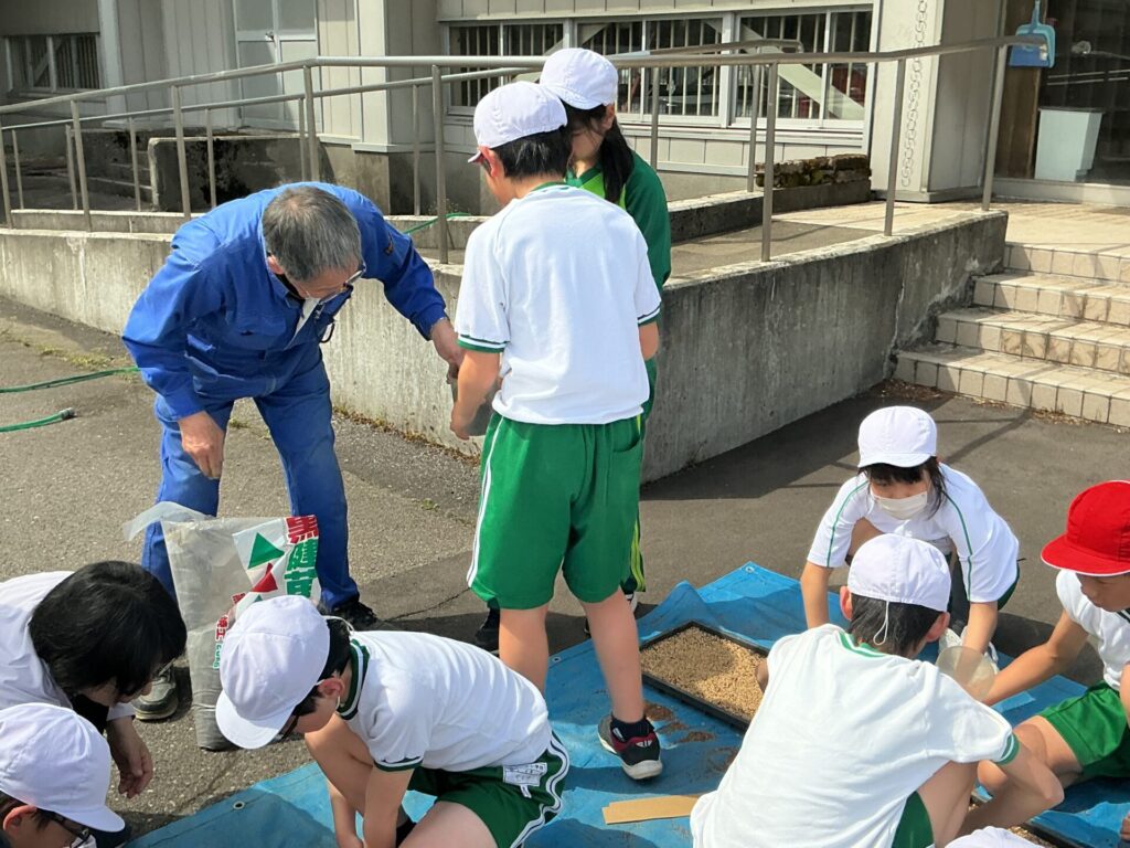 4月17日、5年生いなほタイムです。今年もお米作りをご指導くださるのは、学校田を大切に守ってくださる地域の宝、尾竹様です。御歳80歳を超えてらっしゃいますが、田んぼに立つ姿は凛々しく、まさに私たちの「人生の師匠」。笑顔で迎えてくださり、まずは、「もち米」の種まきを行いました。心を込めて種をまく5年生の姿は、真剣そのものでした。しなやかに、風に吹かれても折れず、力強く根を張る稲穂のように。そして、80歳を超えてもなお、軽やかに田んぼを駆け回る尾竹様のように。5年生は、地域の皆様との関わりの中で、変化を楽しみながら「しなやか」に成長していきたいと考えています。