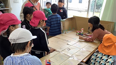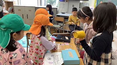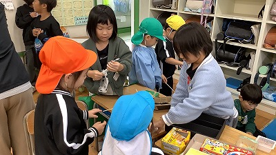 2年生が、地域の東明・栄光こども園の園児たちを、「おもちゃランド」へ招待しました。生活科で作ってきた手作りのおもちゃの遊び方を教えたり、一緒に遊んだりしながら交流を深めていました。子どもたちからは、「こども園のみんなが喜んでくれてうれしかった」「名前を呼んでお話がができて楽しかった」「やり方をていねいに説明すると上手にやってくれてうれしかった」「また来てほしいな」などの声聞こえてきました。一生懸命に準備、おもてなしをした子どもたちには、満足げな笑顔があふれました。いいね!