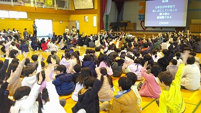 この1週間、5年生が中心となり、6年生と一緒に遊んだり、アンケートをしたりして懇親を深めていました。2月25日(木)に6年生ありがとう集会を行い、歌やクイズ、よっちょれ、など披露し、6年生への「ありがとうの気持ち」を伝えました。6年生も、渾身の創作劇を披露し、会場は温かい雰囲気に包まれました。お互いに感謝の気持ちを伝えあう江南っ子、いいね!