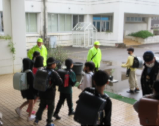 会議の後、子どもたちの下校を送り出し、さっそくパトロールへ出動してくださいました。見守り隊の方々は、「車に気を付けてね」「雨が降らないうちに帰ろうね」と子どもたちに優しく声を掛けてくださいました。