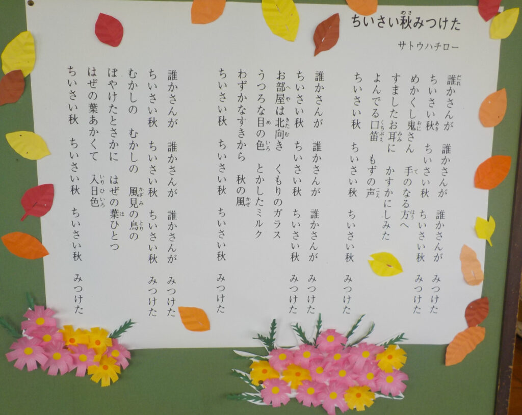 10月2日(木) 10月になって風が少し肌寒くなり、秋を感じるようになりました。教務室前の掲示板には、「ちいさい秋みつけた」の歌詞が…。子どもたちは赤とんぼやキリギリスを見つけていました。みなさんは、どん …