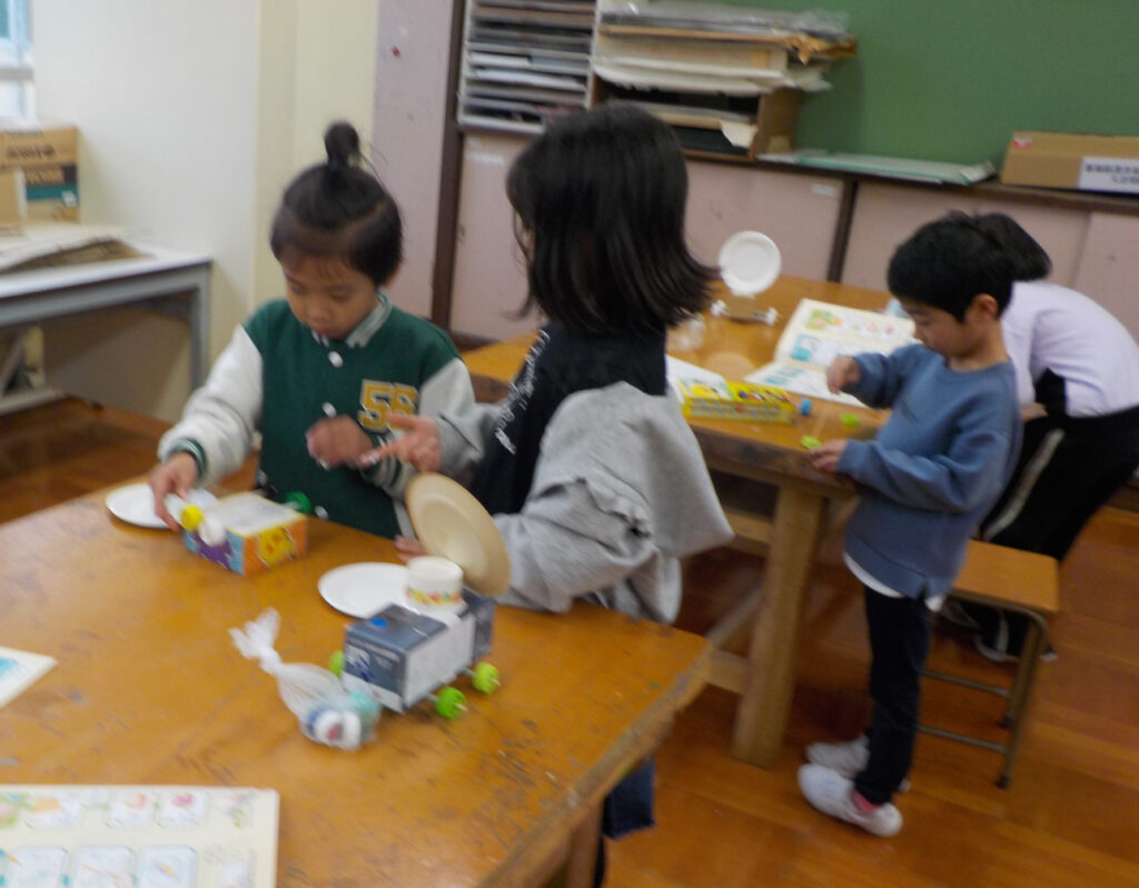 11月18日(火) 1・2年生は生活科で、おもちゃを作っています。空き箱や紙皿、ペットボトルなどの身の回りにあるものを使って、楽しく遊べるおもちゃを作っていました。空き箱と紙皿を使って、風を受けて走るパ …
