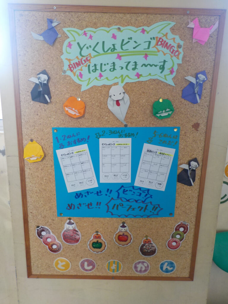 11月6日(木) 「読書ビンゴはじまってまーす!」と、図書館前のメッセージボードにありました。秋の読書週間のプレイベントとして開催されています。おすすめの本を読んで、ビンゴになると…1ビンゴで「+1冊券」 …
