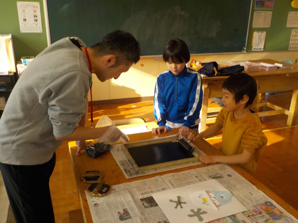 12月18日(木) 1・2年生は、版画を刷っていました。黒か青のインクを選び、ローラーで作った版にインクをのせていきます。凹凸があるので、インクをのせるのに一苦労。でも、きれいに刷り上がっていました …