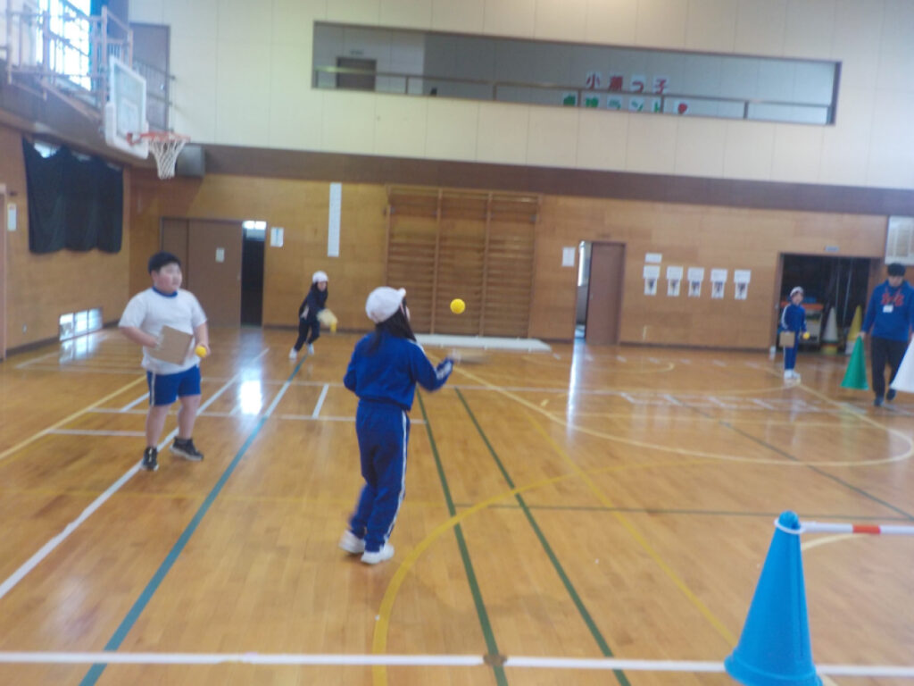 1月13日(火) テニポン 3年生が体育で、手作りの段ボールを手につけて、ボールを上に向かってついていました。連続で70回以上もつけた子もいます。それを生かして、テニスとピンポンの合体スポーツ「テニ …