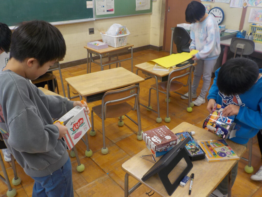 1月14日(水) ともだちハウス 1・2年生は図工で、「ともだちハウス」をつくっています。まず、スチロールに顔を描いて自分と友達をつくりました。そして、二人がいる家をお菓子の空き箱などを使ってつ …