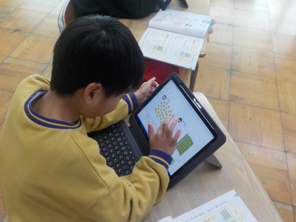 1月15日(木) 新しいタブレットで 1年生が算数「おおきいかず」で、新しいタブレット端末を使っていました。教科書にある2人のブロックの数を数えて、どちらが多いか比べます。タブレットに教科書と同 …