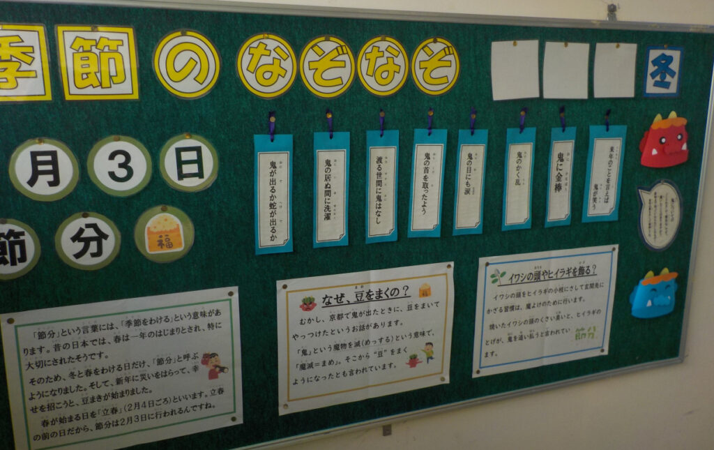 1月21日(水) もうすぐ節分 1月もあっという間にあと少しで終わろうとしています。2月に入るとすぐに節分で、季節の変わり目ですね。図書館掲示板には、季節のなぞなぞで、節分について掲示されていま …