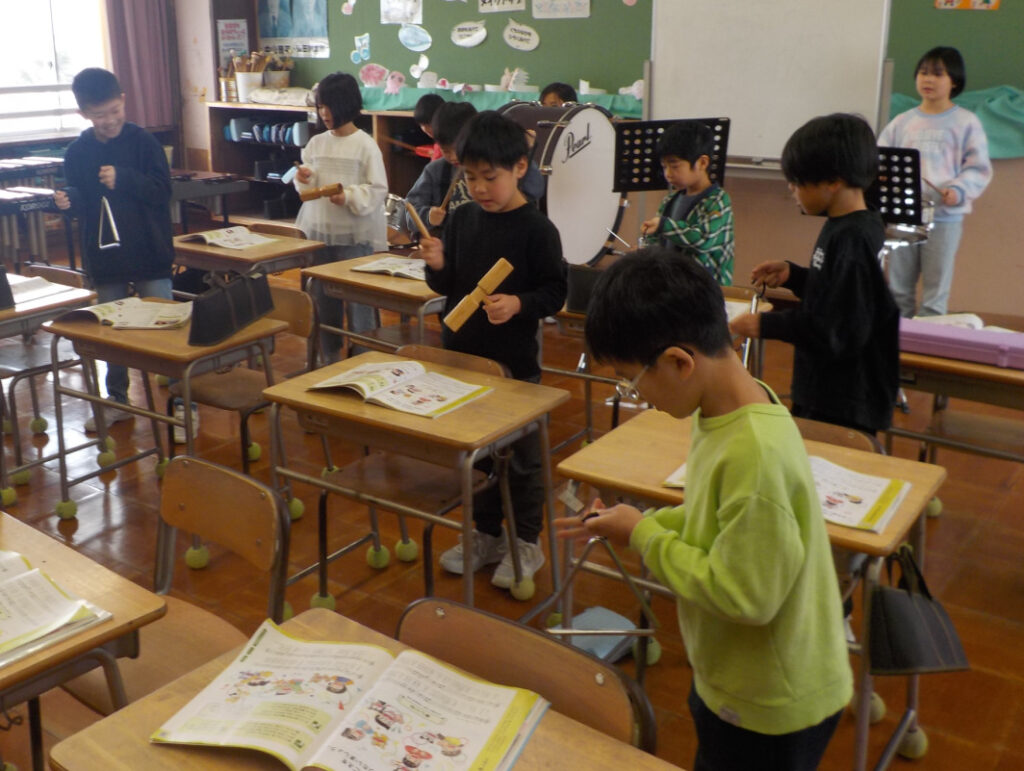 1月28日(水) 楽しいね♪ 1・2年生は音楽で、「楽しいね」の曲に合わせて、リズム打ちをしていました。選んだ打楽器を曲の「た~のし~い~ね(♩♩♩)」の♩に合わせてたたきます。楽しく歌いながら、みん …