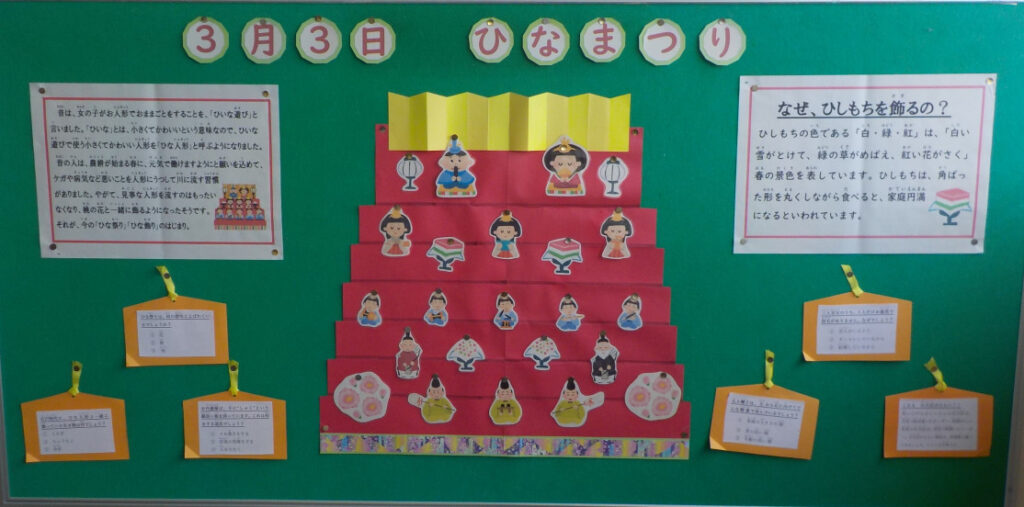 2月13日(金) 雛飾り 掲示板に雛飾りが登場しました。雛祭りや菱餅の説明、雛祭りにちなんだクイズなどが掲示されています。図書館にも雛壇が準備されていて、これから雛人形が飾られていきます。3月3 …