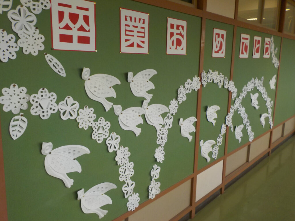 2月20日(金) 卒業おめでとう 1階の廊下に「卒業おめでとう」のステキな掲示が貼られました。鳥が羽ばたくイメージで、白がとても映えています。今日から、全校で6年生を送る会で歌う「ありがとう」の …