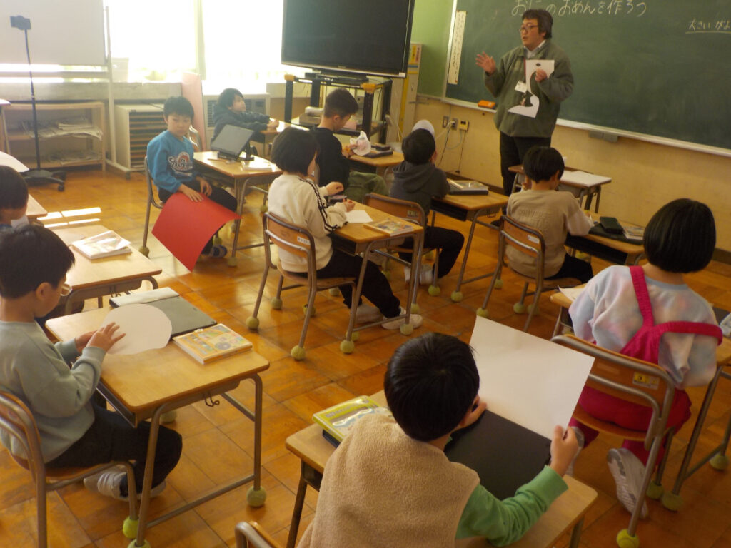 2月4日(水) 鬼のお面 1・2年生は図工で、鬼のお面を作りました。タブレット端末で鬼の画像を選び、それを参考にして画用紙に鬼を描きます。ハサミで切り取って目を開けて、頭につけるための輪を着けて …