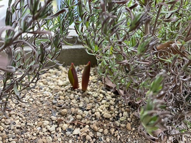 3月11日(水) 森の中の小人? 前庭の草木が春に向かって少しずつ伸びています。玄関のラベンダーの中に、小人のような芽を見つけました。チューリップ🌷?と思いますが、緑ではなく紫色が2つちょこんと並んで …