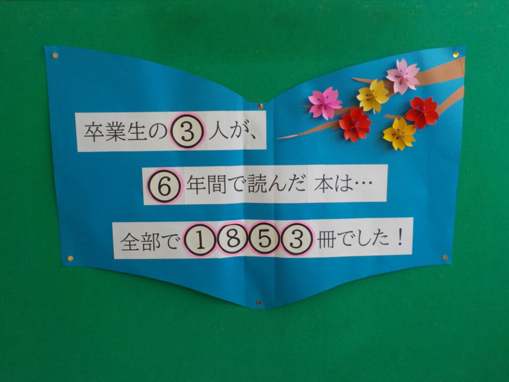 3月16日(月) 卒業生が読んだ本 図書館の掲示に、卒業生3人が読んだ本の冊数が掲示されています。6年間で1853冊になったようです。たくさんの本を読んで、多くのことを学んだことでしょう。こ …
