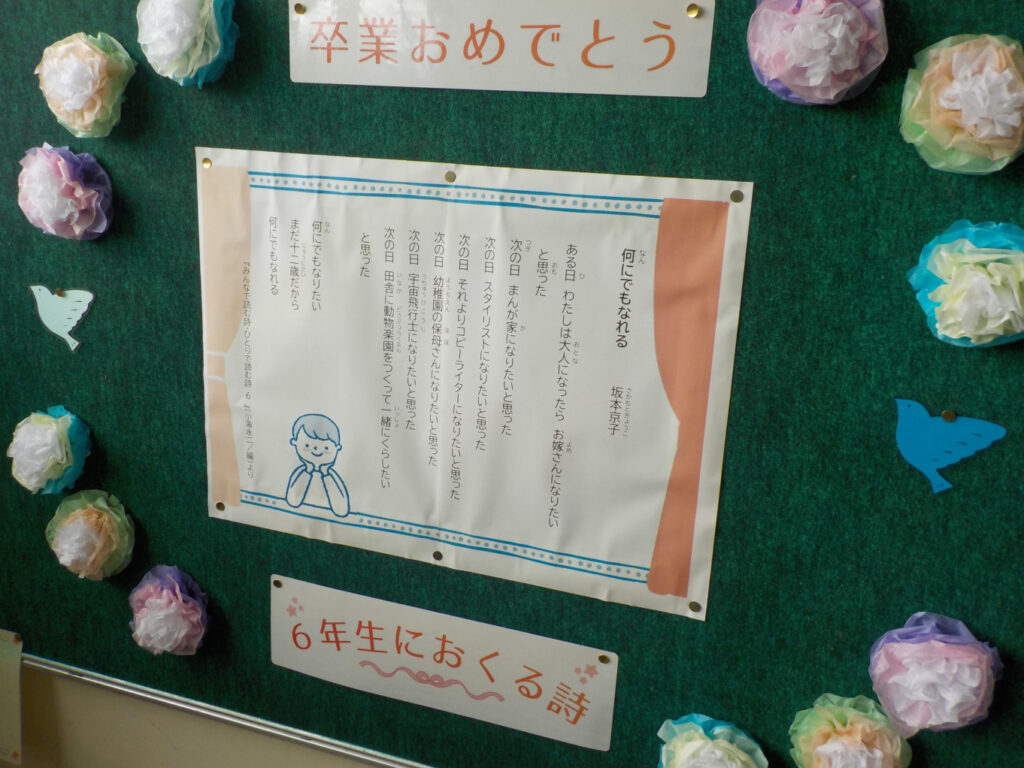3月4日(水) 6年生におくる詩 掲示板に6年生におくる詩が貼られていました。「何にでもなれる」という詩です。昨日の保健室掲示と同じで、12年生きてきても、まだまだこれからが長く無限大。これからの …