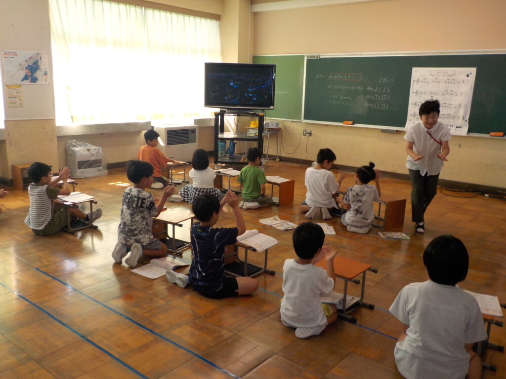 9月24日(水) 1・2年生の音楽では、「山のポルカ」の曲にのってリズム打ちをつくりました。タ・タ・ウンなどのリズムを考え、みんなで歌いながら、2拍子のテンポに合わせて手をたたきました。 5・ …
