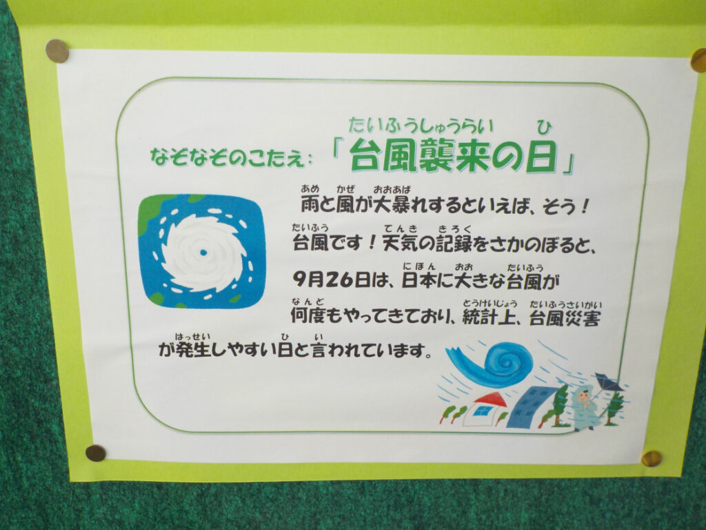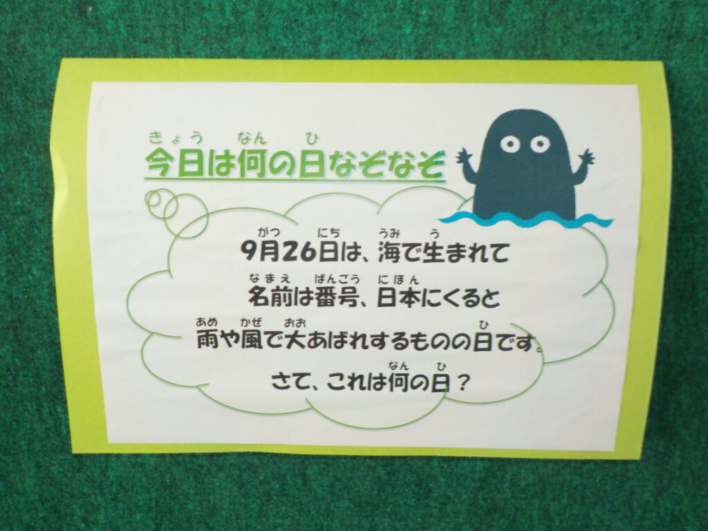 9月26日(金) 昨日のなぞなぞの答えは… 台風襲来の日でした!秋にちなんだ「季節のなぞなぞ」が6つ掲示されています。どんどんチャレンジしてほしいですね。全部できるかな? 2年生は、算数 …