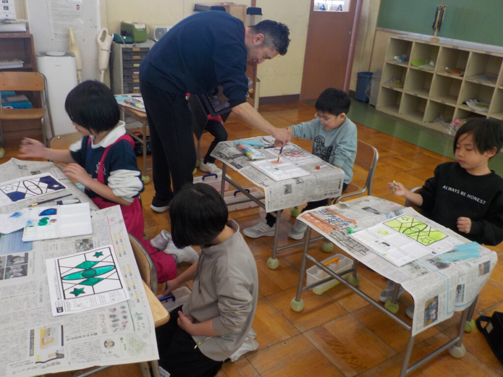 1月30日(金) 1色でいろいろ 1・2年生は図工で、絵の具で色を塗る練習をしていました。自分で1つの色を選んでパレットに出し、塗り絵のように塗っていきます。1色の絵の具ですが、水のつけ具合で色 …