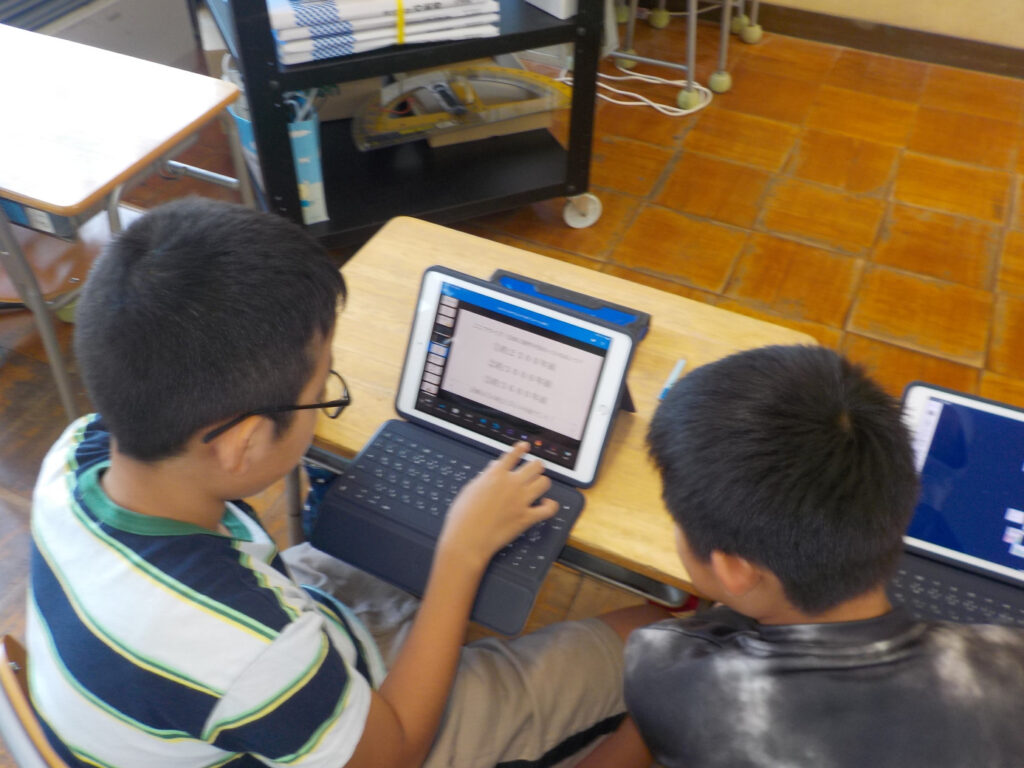 5・6年生は総合で、米について調べたことをまとめて発表するプレゼンを仕上げていました。友だちとプレゼン画面を見て、文字が動くアニメーションのつけ方などをチェックし合っていました。