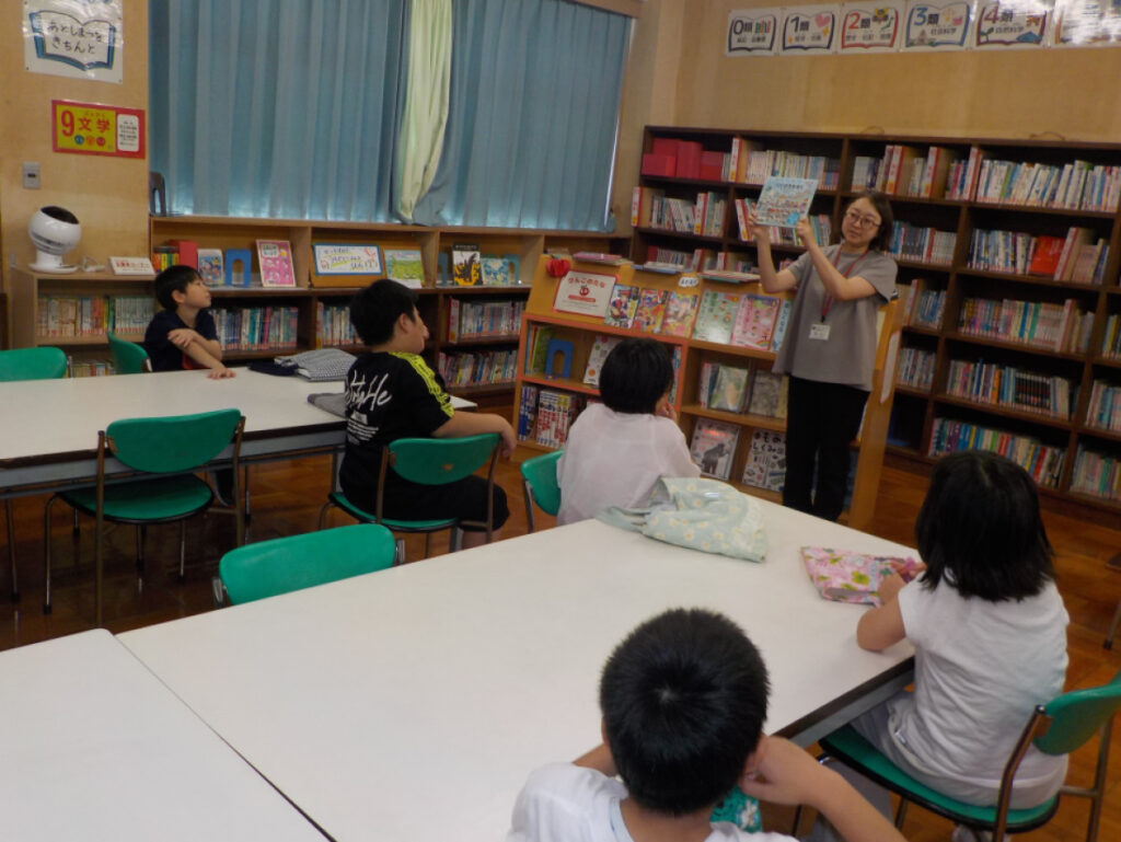 2・3年生は、図書館で読書をしています。図書館司書からおすすめの本を紹介してもらいました。各グループに置かれた本の中から「読みたい!」と思った本を選んで、おもしろさを味わっていました。