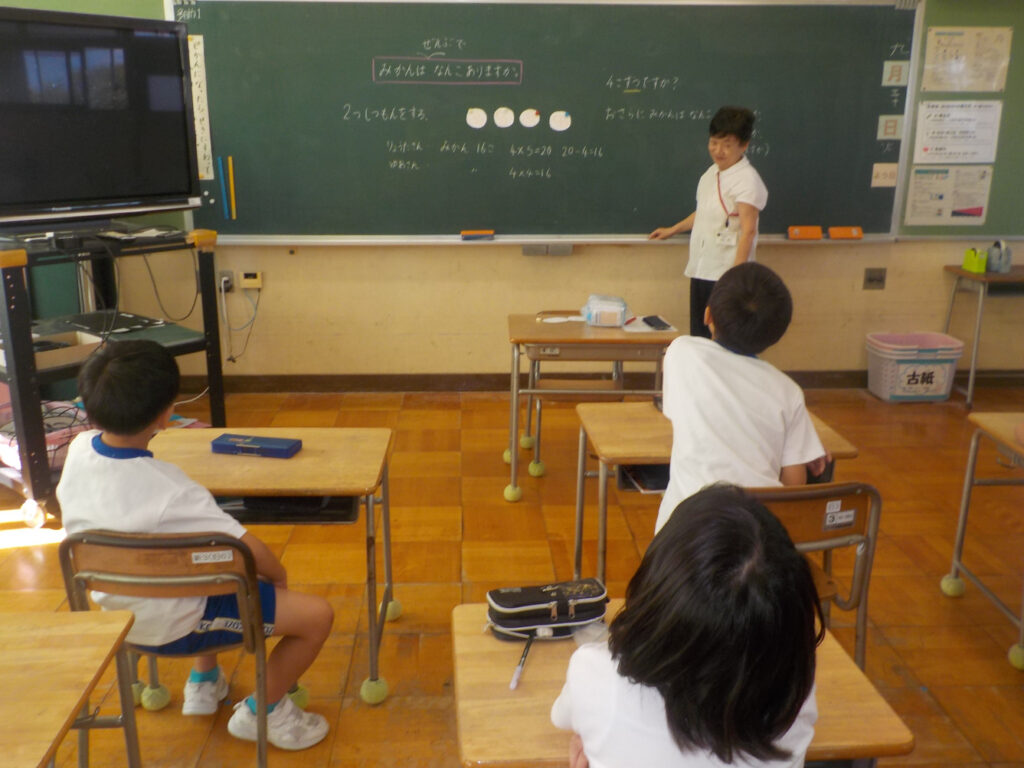 2年生の算数では、お皿にのったみかんがいくつあるかを考えました。お皿は4枚。でも、お皿にのっているみかんはシークレット。子どもたちは、みかんがいくつあるかを予想して、4✕みかんで数を出そうとしていました。でも、お皿のみかんは全部同じ数ではないひっかけ問題。子どもたちは、みかんの数がわかると、すぐに掛け算と足し算をつかって答えを求めていました。