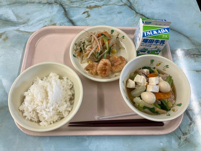 ご飯、うずら卵入り豆腐の中華煮、エビの唐揚げ、もやしのサラダ、牛乳 でした。