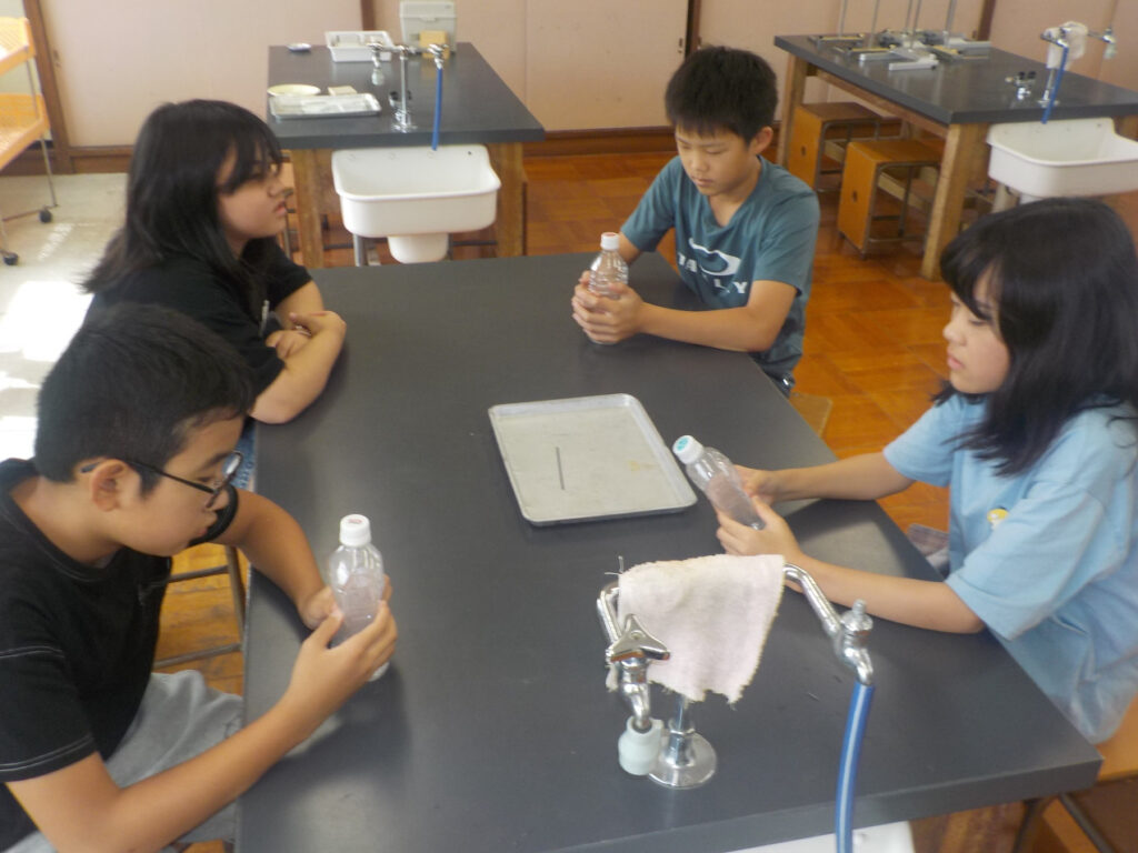 5・6年生は、理科で雲をつくっていました。まず、ペットボトルにぬるま湯を入れます。次に、火をつけた線香の煙を入れて、蓋をして降ります。そして、ペットボトルを押したり、ゆるめたりしていると…。ペットボトルの中には、もくもくと白い雲が!ふたを開けると雲が煙のように飛び出してきました。どうして、雲ができたんだろう?その秘密はわかったかな?
