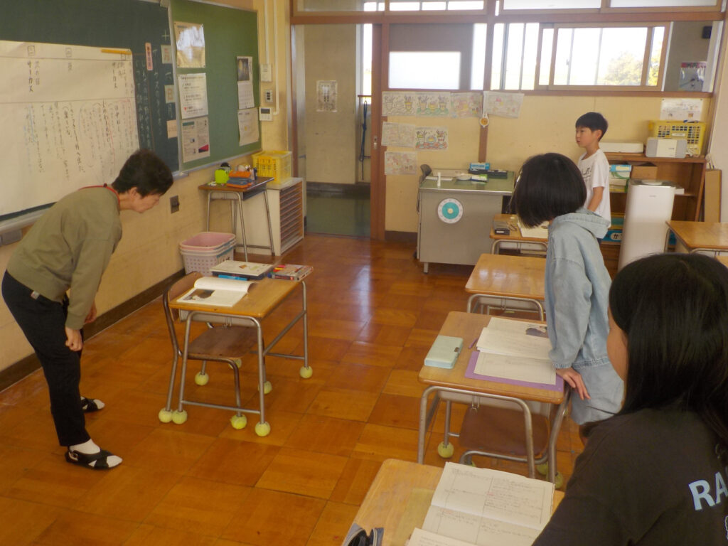 3年生は国語で、「サーカスのライオン」を学習していました。ライオンのじんざが男の子と出会って気持ちが変わっていく様子を読み取っていました。「『のりだして』は、どんな動き?」など、実際に動作してみて、じんざの気持ちの動きに迫っていました。
