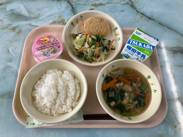 ご飯、白玉汁、里芋コロッケ、アーモンド和え、デザート、牛乳 でした。