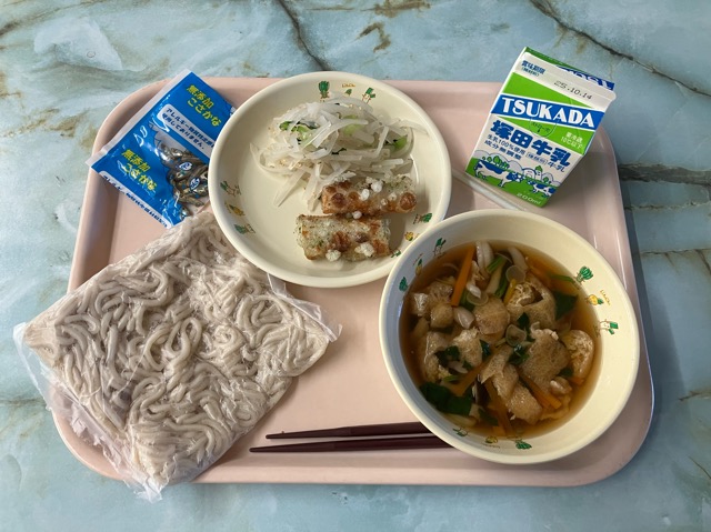 大麦麺、肉汁、ちくわの磯部揚げ、大根の浅漬け、乾燥小魚、牛乳 でした。