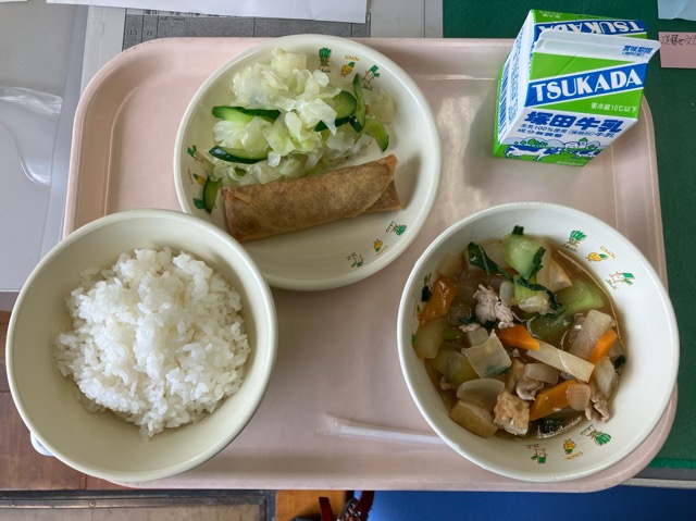 ご飯、大根のオイスターソース煮、春巻、風味漬け、牛乳 でした。