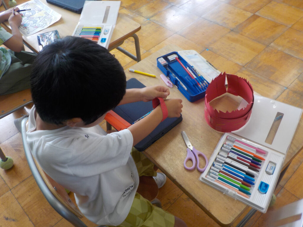 1年生は、図工で変身グッズをつくっていました。頭に着けたり、腕に着けたりして変身します。一人一人のこだわりがあるようで、すべて身に着けるとどうなるのか、とても楽しみです。