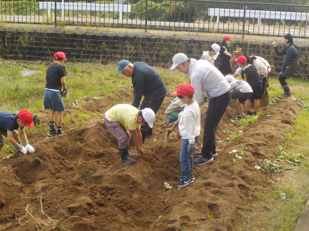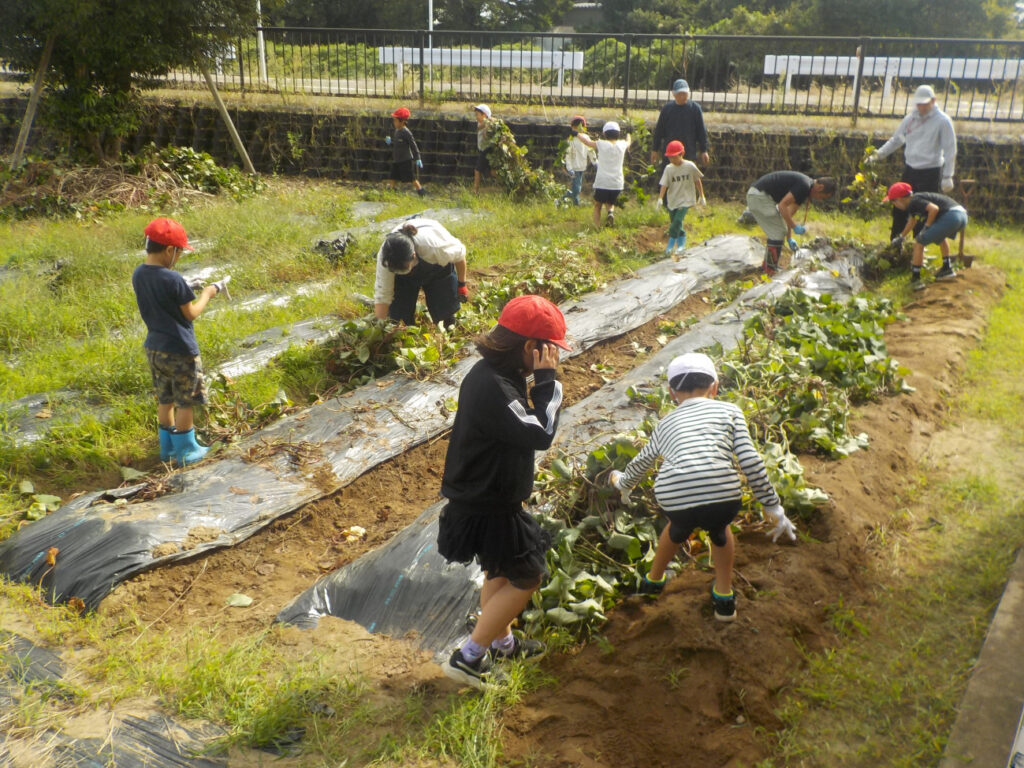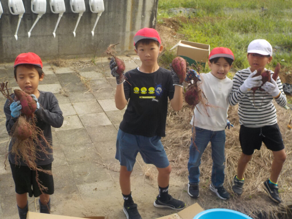 1・2年生は、いもほりをしました。ツルを取った後のうねから、大きなサツマイモがゴロゴロと出てきました。とれたイモは、これからどうするのかな?
