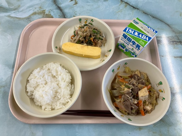 ご飯、すき焼き、厚焼き卵、ゴマ酢和え、牛乳 でした。