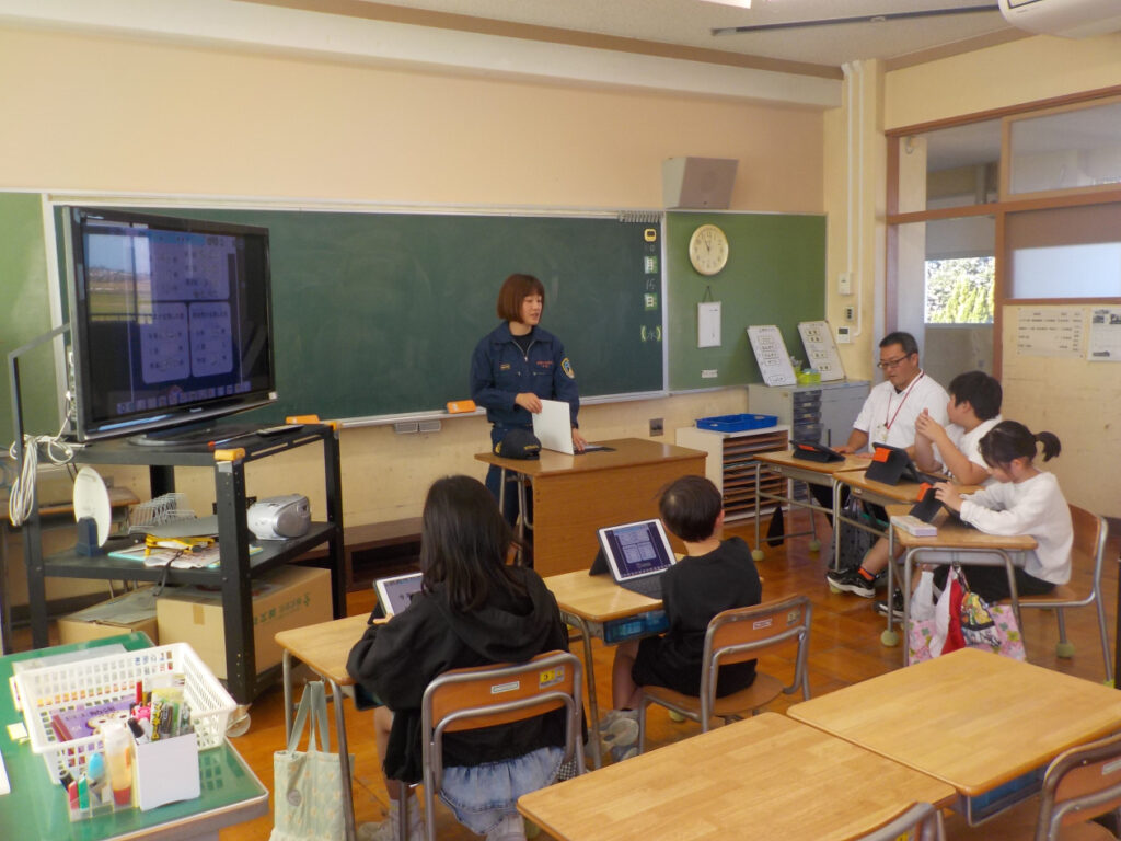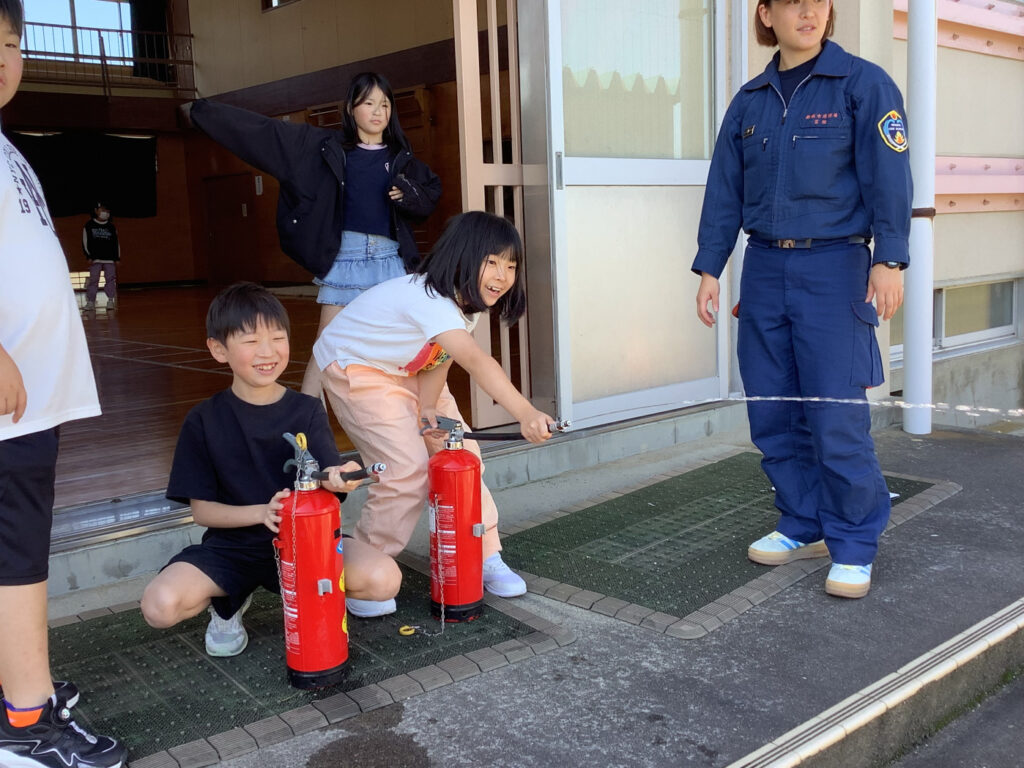 3年生は、リトルファイヤースクールを行いました。消防署の方から来ていただいて、火事の状況や消防士の仕事などについて話を聞いた後、消火器を使っての消火訓練を体験しました。
