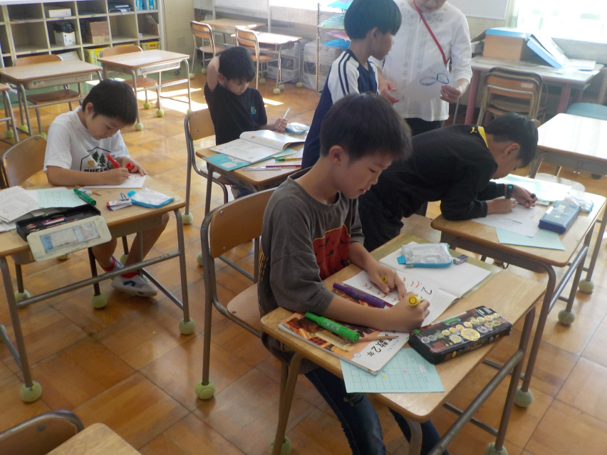 2年生の算数では、九九の学習をしています。例えば、りんごが2つずつ5皿でいくつ?を2✕5で表し、その絵をカードに描いていました。これから、どんどん九九が進んでいくので、ただ九九を唱えるように覚えるだけでなく、絵を描くように九九をイメージしていけるとよいですね。