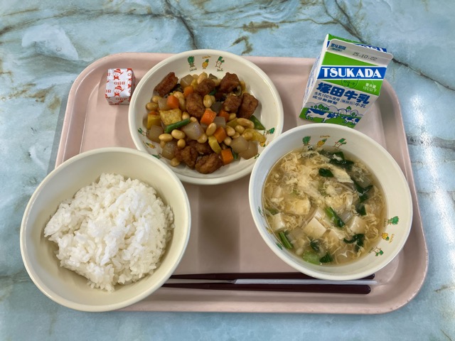 ご飯、かき玉スープ、豚肉と大豆の揚げ煮、チーズ、牛乳 でした。