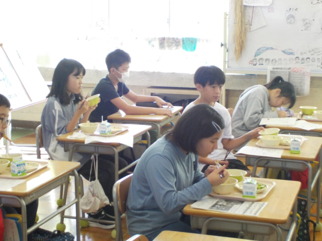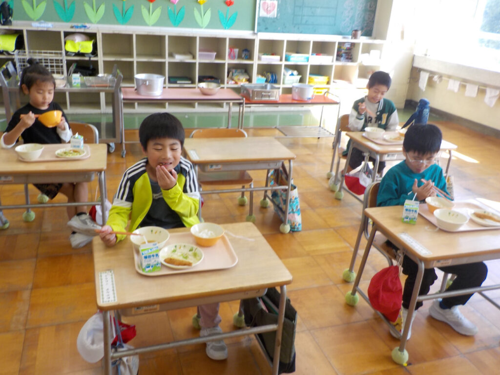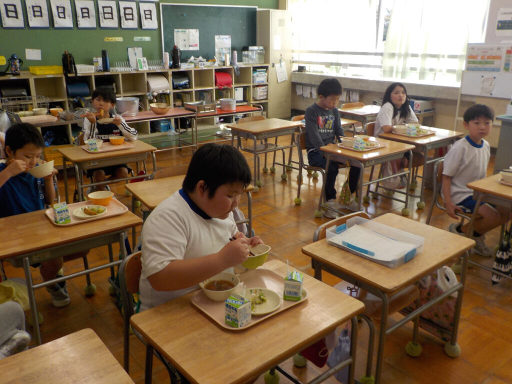 給食の時間の様子です。どの学級も落ち着いて給食を食べています。好き嫌いはあるようで、苦手なものは減らしたり、大好きなものはお替りしているようでした。校内放送で毎日、「つくってくださった方や考えてくださった方に感謝して食べましょう!」というメッセージが読まれます。給食に携わる人だけでなく、食材そのものの命にも感謝していただきましょう。