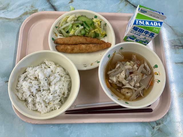 菜飯、鶏ごぼう汁、ししゃもフライ、白菜漬け、牛乳 でした。