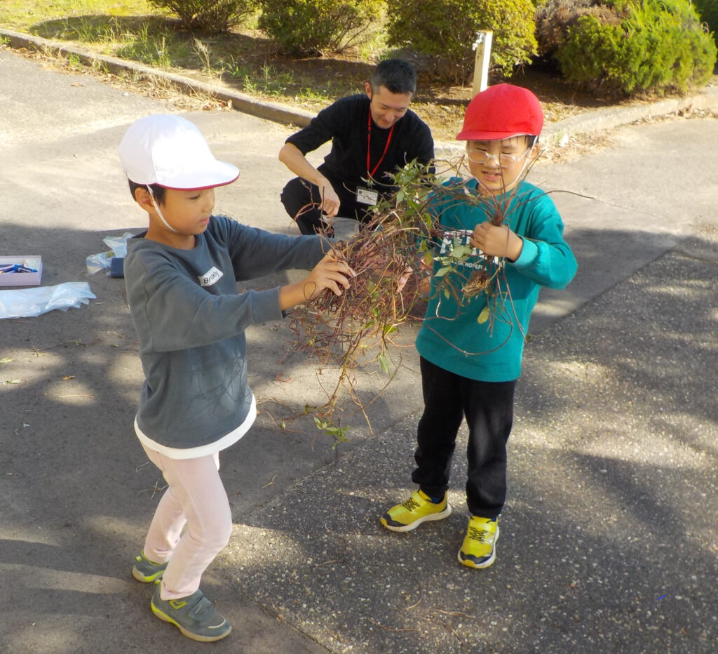 1年生が、一生懸命に水やりをして育ててきたアサガオを片付けていました。たくさん花をつけて、たくさんの種がとれました。種からまた発芽したアサガオも見つけていました。アサガオのツルは大切にとっておいて…さあ、何になるのでしょう?